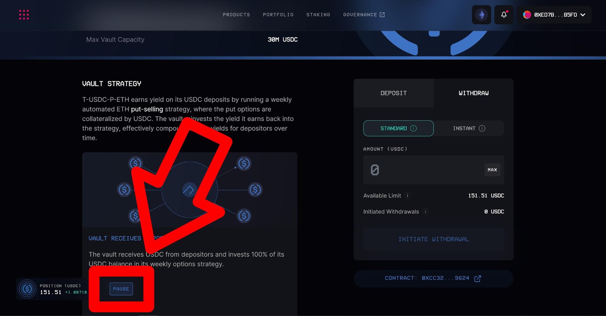 After the transaction has been confirmed onchain, a notification will appear in the upper section. Your funds are now paused, so the vault will put them on hold starting from the following Friday.