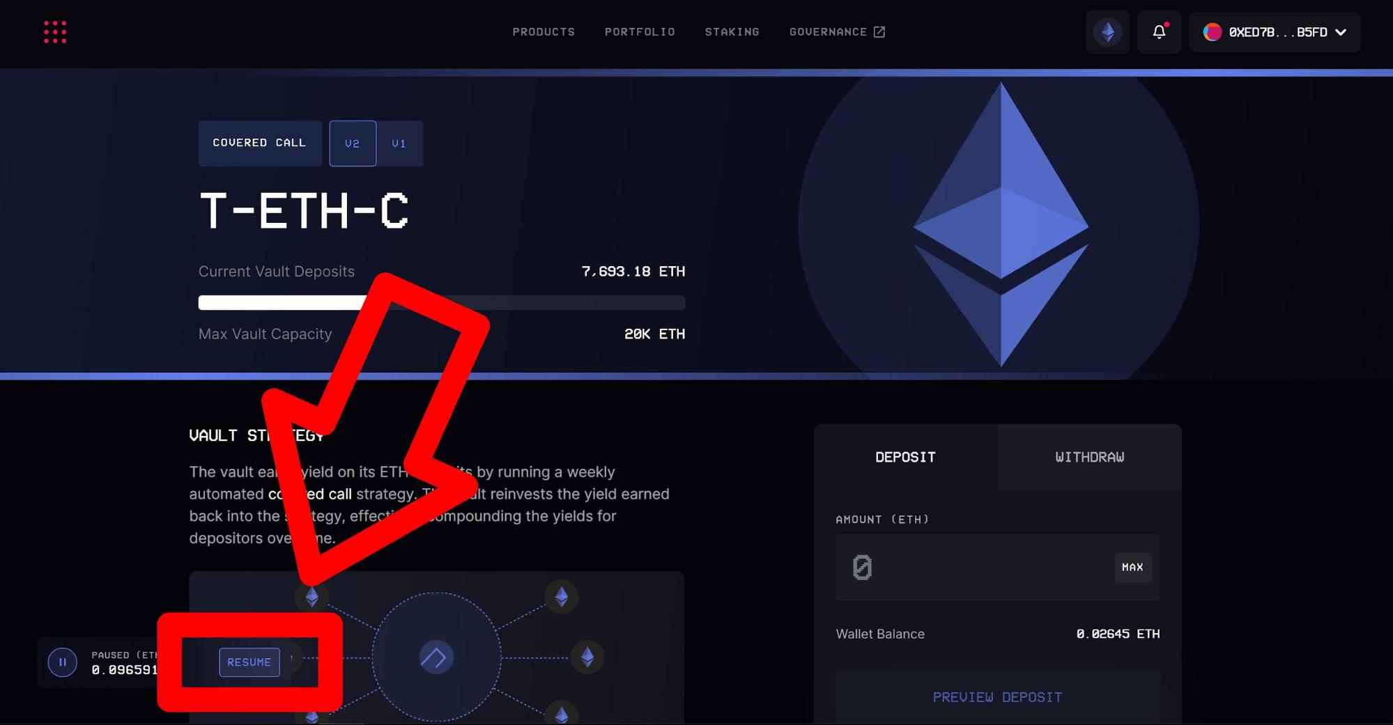 Select the vault in which you deposited and in which you paused funds. You will notice the presence of the "RESUME" button right near your position bar at the bottom (desktop and mobile).